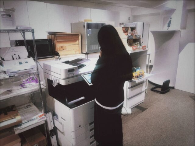 午後からの撮影に向けて、アイテムチェックや香盤表のプリント、撮影資料の準備を進めます。スタイリストの方がいない現場は、リースアイテムのアイロンがけやシューズの底張りも行います。